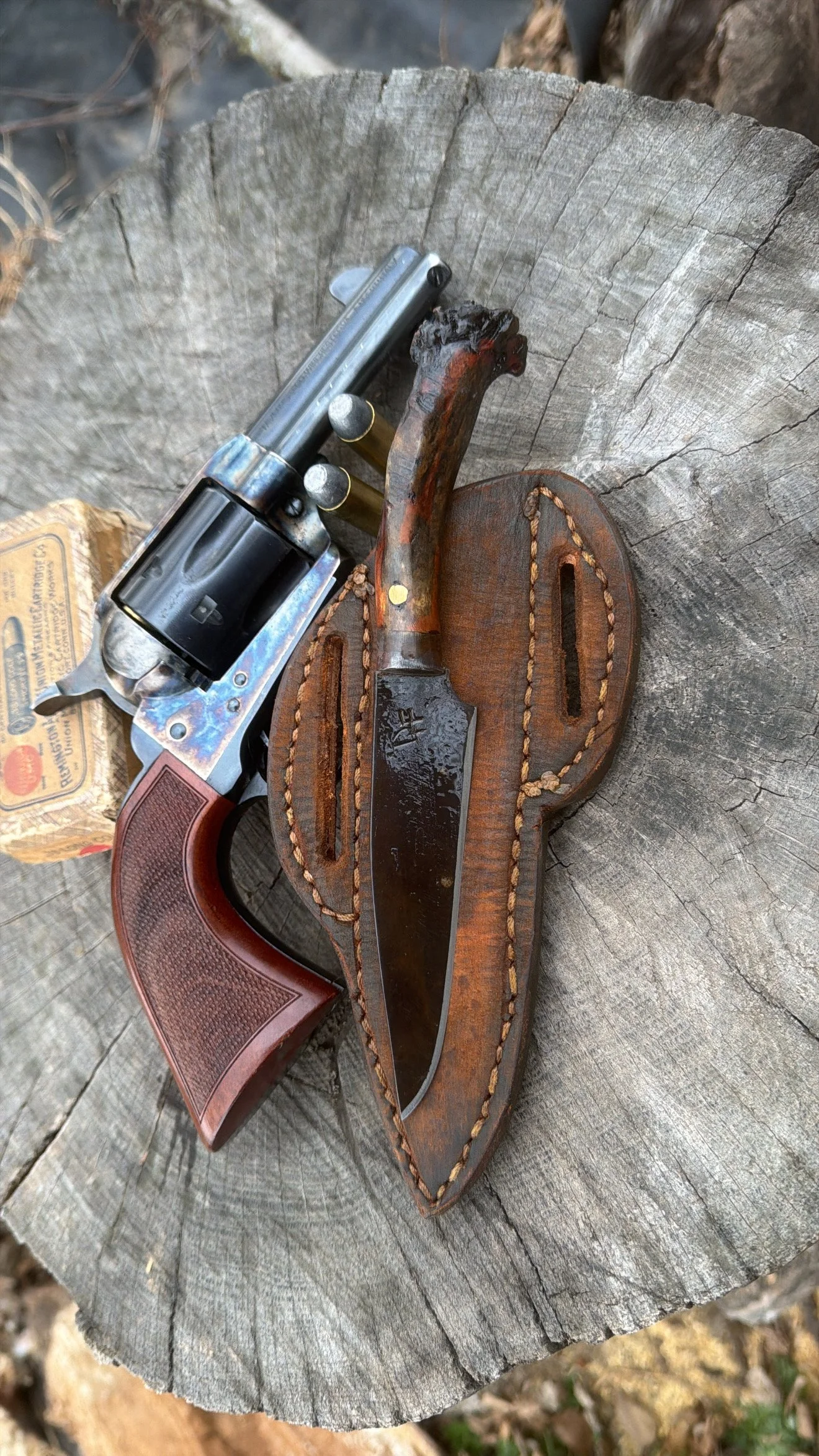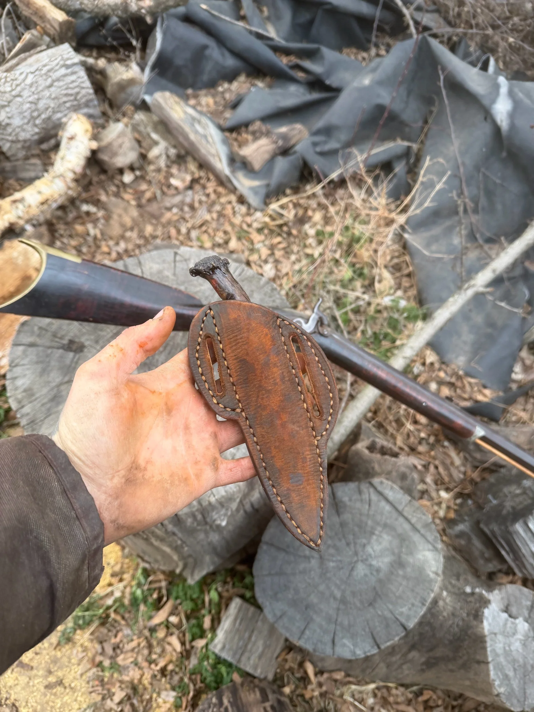 All of my knives made are aged using various different kinds of techniques for both knife and sheath. My goal I shoot for each and every time is for it to look like you found them laying in a barn forgotten, or an heirloom piece handed down through generations.