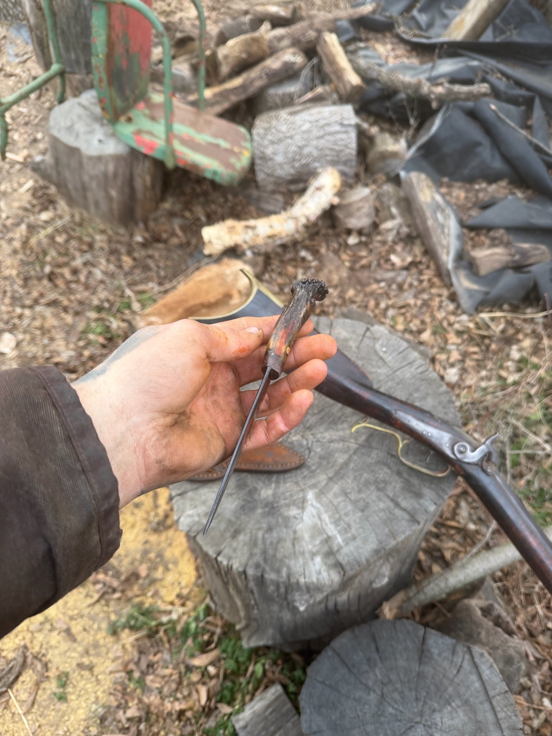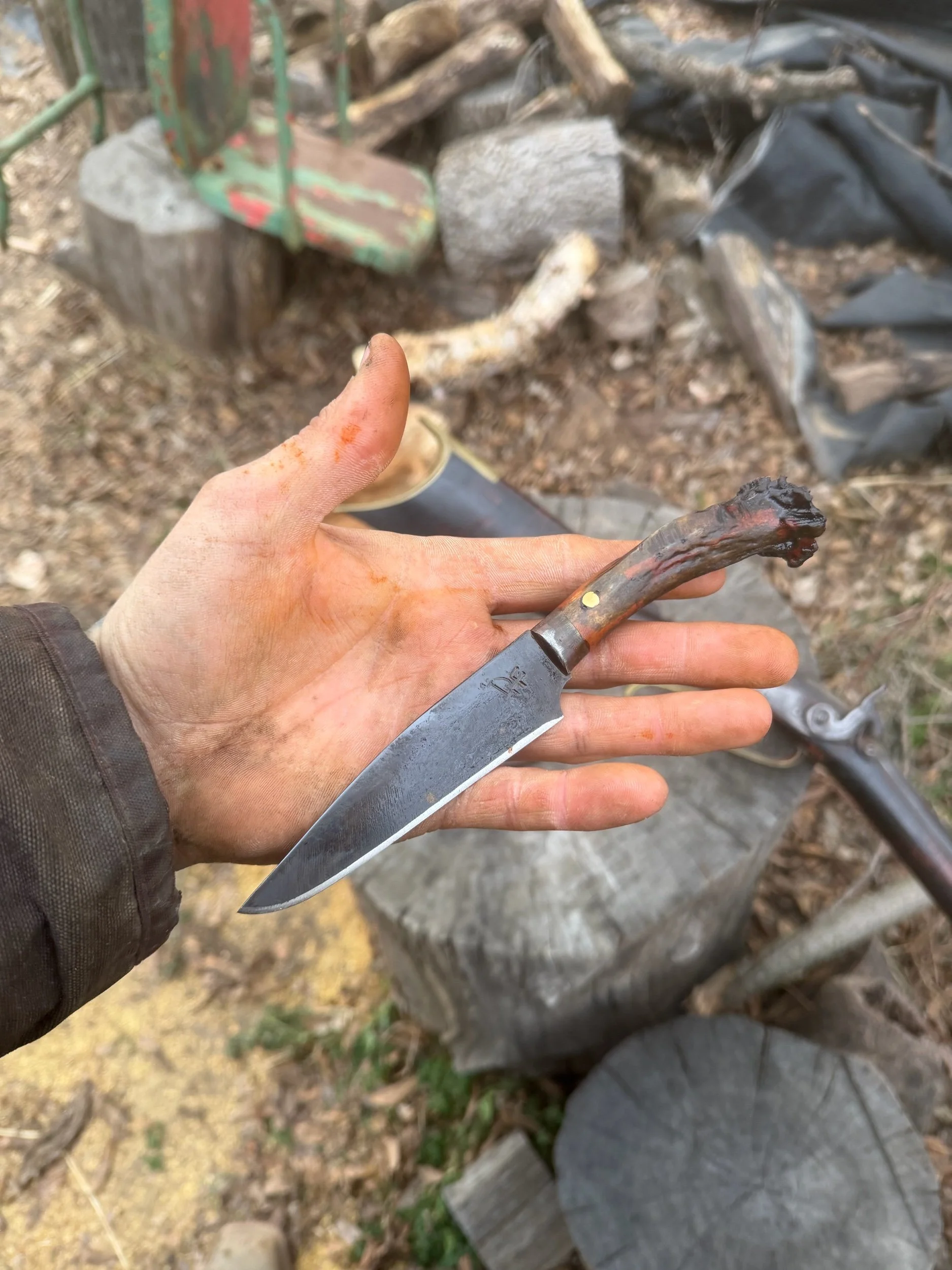 The blade is forged, and finished the exact same way they have been made for centuries. The steel is 1095 high carbon steel that produces a very sharp blade. Every blade that is made in my shop is hand filed the only time it touches a grinder is for sharpening. This knife has some file marks left in to show it’s truly handmade. The blade also has a rust patina to help prevent it from further rust to ensure you have a great tool to use for not only your lifetime but your children’s too.