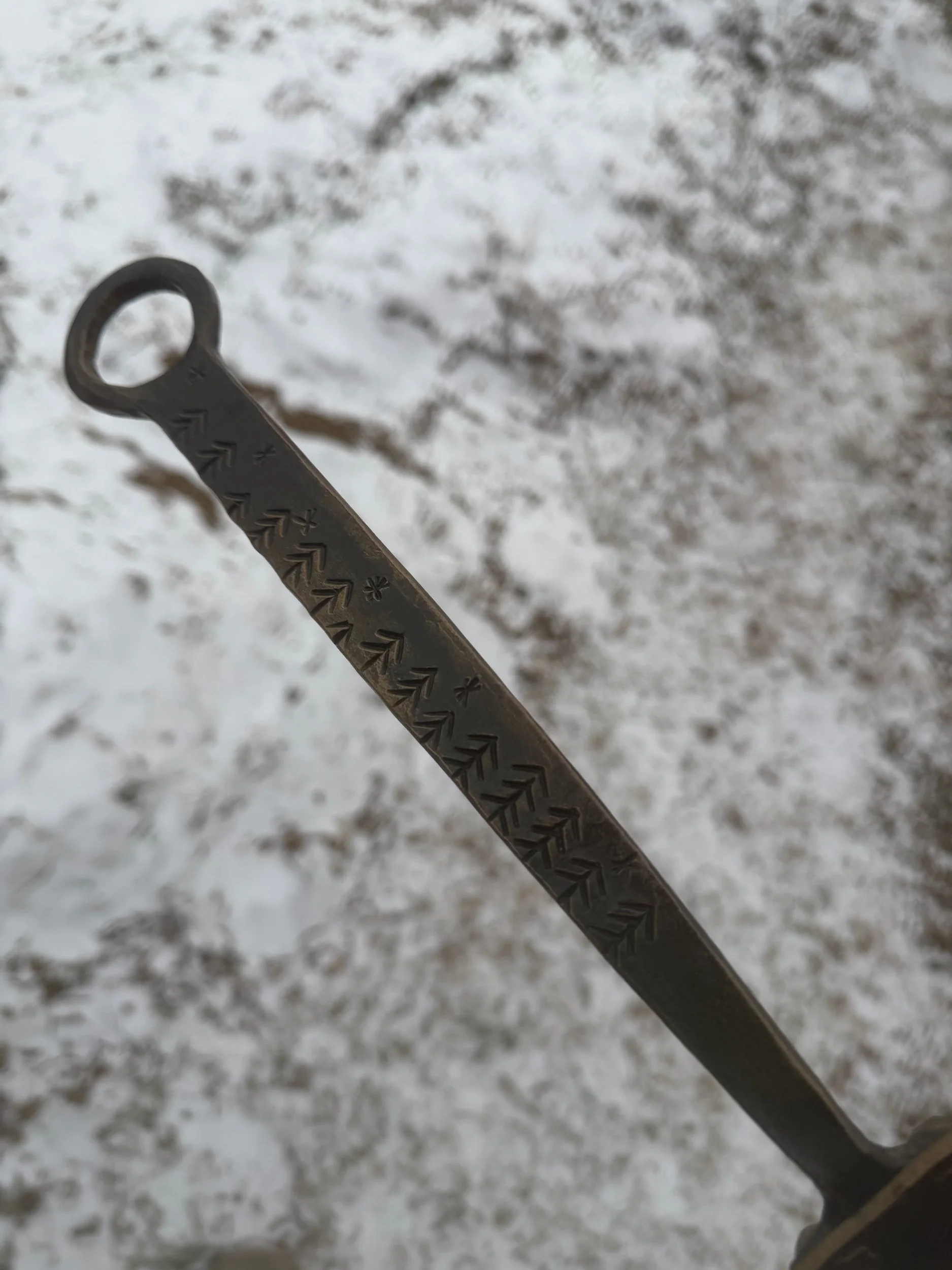 The Handle (10” long): is forged at the anvil and decorative cuts are added to make it stand out from others which are done completely freehand meaning there are no two completely alike. The handle also sits up higher compared to others which is something I prefer to keep your hand as far away from the hot stove as possible.